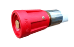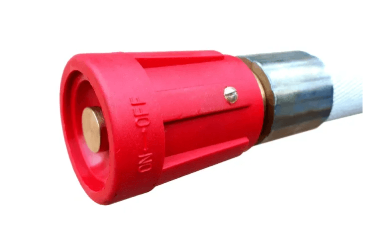 Esguicho: Corpo interno em latão e manopla para regulagem de abertura e fechamento em borracha vermelha